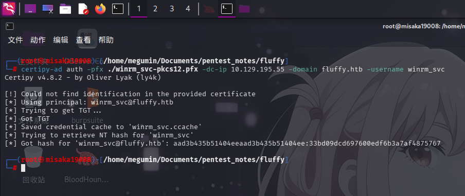 # 4. 利用包含Administrator用户认证凭据的证书请求其NTLM哈希