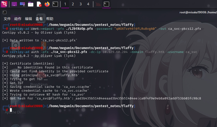 certipy-ad cert -export -pfx ./L2btNzOp.pfx -password "q0OXTvrh97dfLRu8vgA0" -out ca_svc-pkcs12.pfx