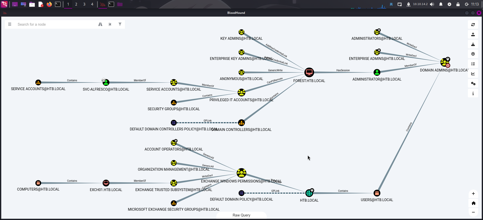 Account Operators对用户组Exchange Windows Permissions有GenericAll完全控制权限,而后者又对整个域对象HTB.LOCAL有WriteDACL权限。