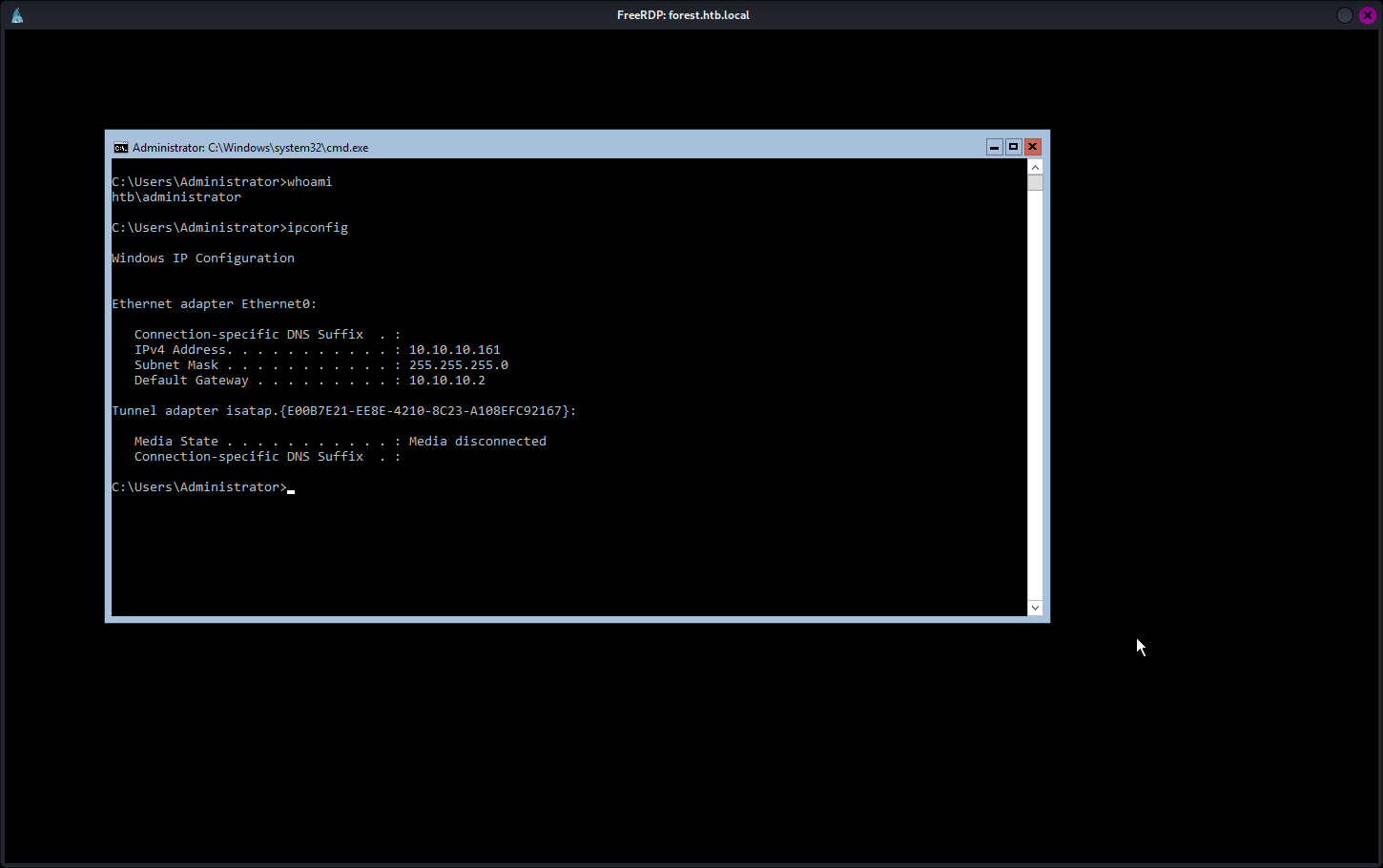 xfreerdp /v:forest.htb.local /u:Administrator /p:Asd310056 /size:1440x900