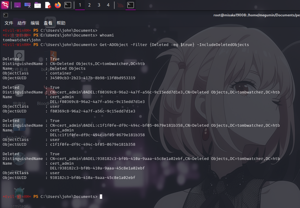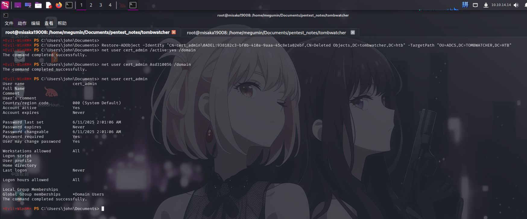 Restore-ADObject -Identity "CN=cert_admin\0ADEL:938182c3-bf0b-410a-9aaa-45c8e1a02ebf,CN=Deleted Objects,DC=tombwatcher,DC=htb" -TargetPath "OU=ADCS,DC=TOMBWATCHER,DC=HTB"