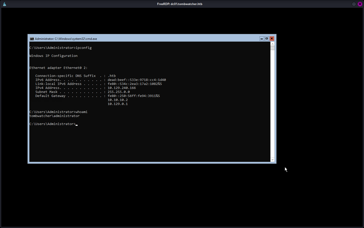 xfreerdp /v:dc01.tombwatcher.htb /u:Administrator /p:"Asd310056" /size:1440x900