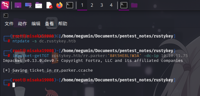 impacket-getTGT rustykey.htb/rr.parker:'8#t5HE8L!W3A' -dc-ip 10.10.11.75