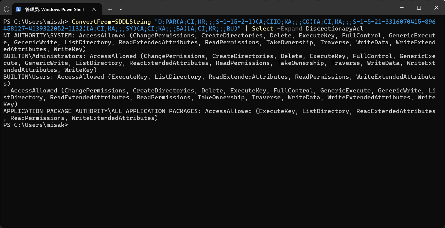 $SD = New-Object Security.AccessControl.RawSecurityDescriptor -ArgumentList "O:BAD:(A;;CCDCLCSWRPWPDTLOCRSDRCWDWO;;;S-1-5-21-3316070415-896458127-4139322052-1125)"