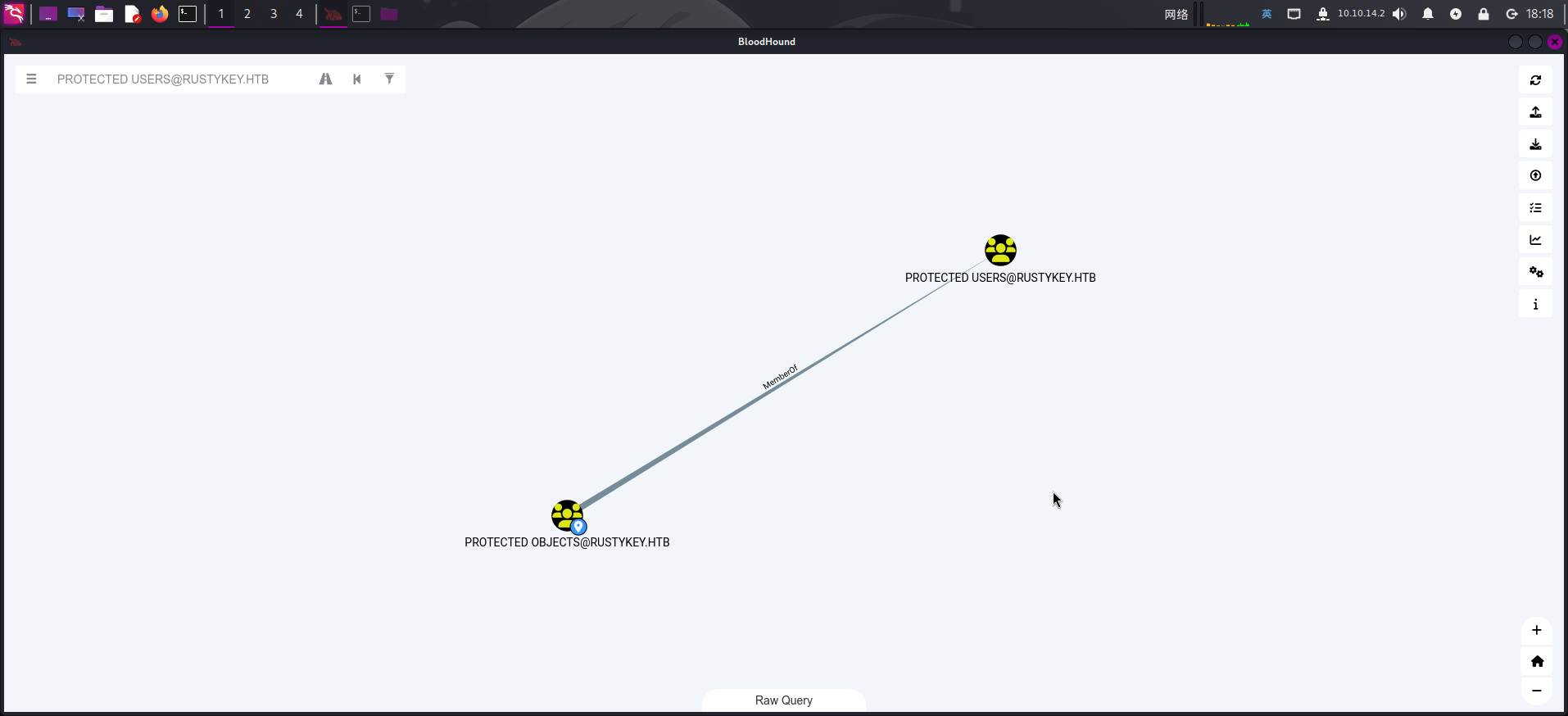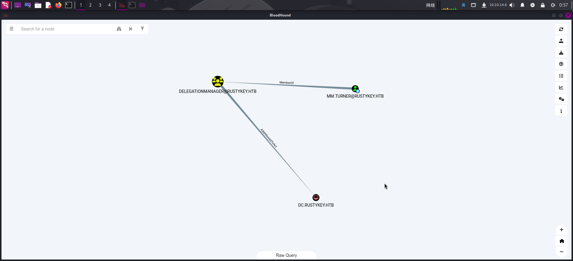 移动至mm.turner用户后,再次查看BloodHound数据分析,发现当前用户所属的用户组DelegationManager对机器账户DC具有AddAllowedToAct权限,即当前用户mm.turner可以修改机器账户对象DCmsDS-AllowedToActOnBehalfOfOtherIdentity安全组属性。