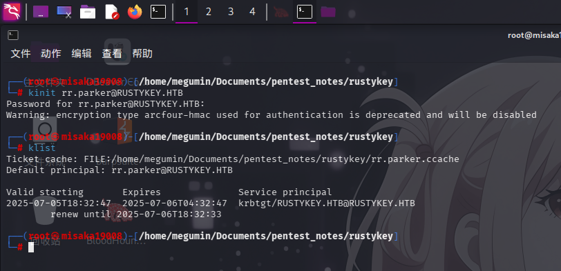 配置完毕后,使用kinit命令尝试获取rr.parker用户的TGT票据: