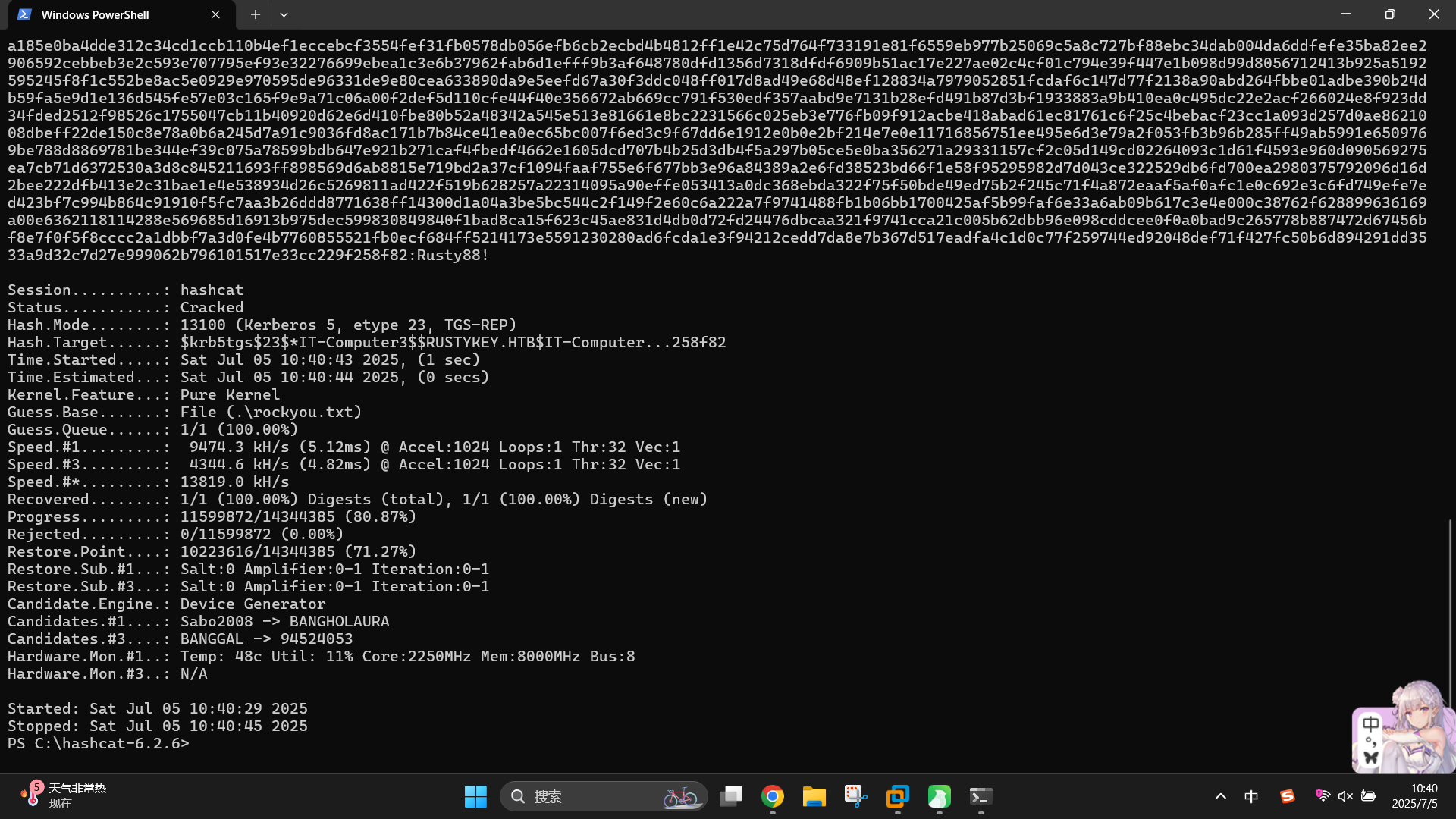 第一步,由于攻击路径的起始点为IT-Computer3用户,因此我们需要使用hashcat工具,对先前获取该用户TGS-REP哈希进行破解: