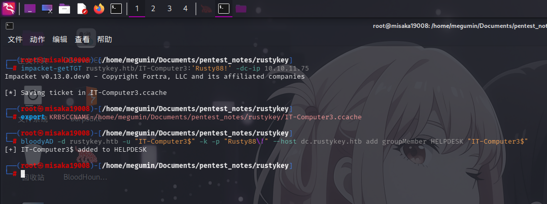 随后,利用该凭据获取TGT票据,并添加IT-Computer3用户自身到HelpDesk用户组内: