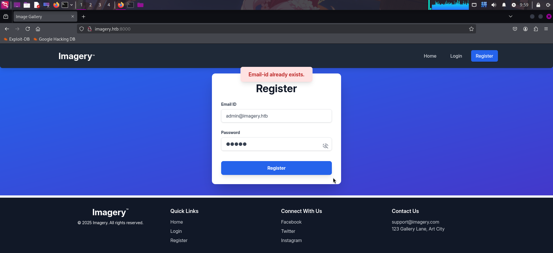 点击主页Register按钮,转到注册页面。尝试注册账号admin@imagery.htb,发现账号已经存在: