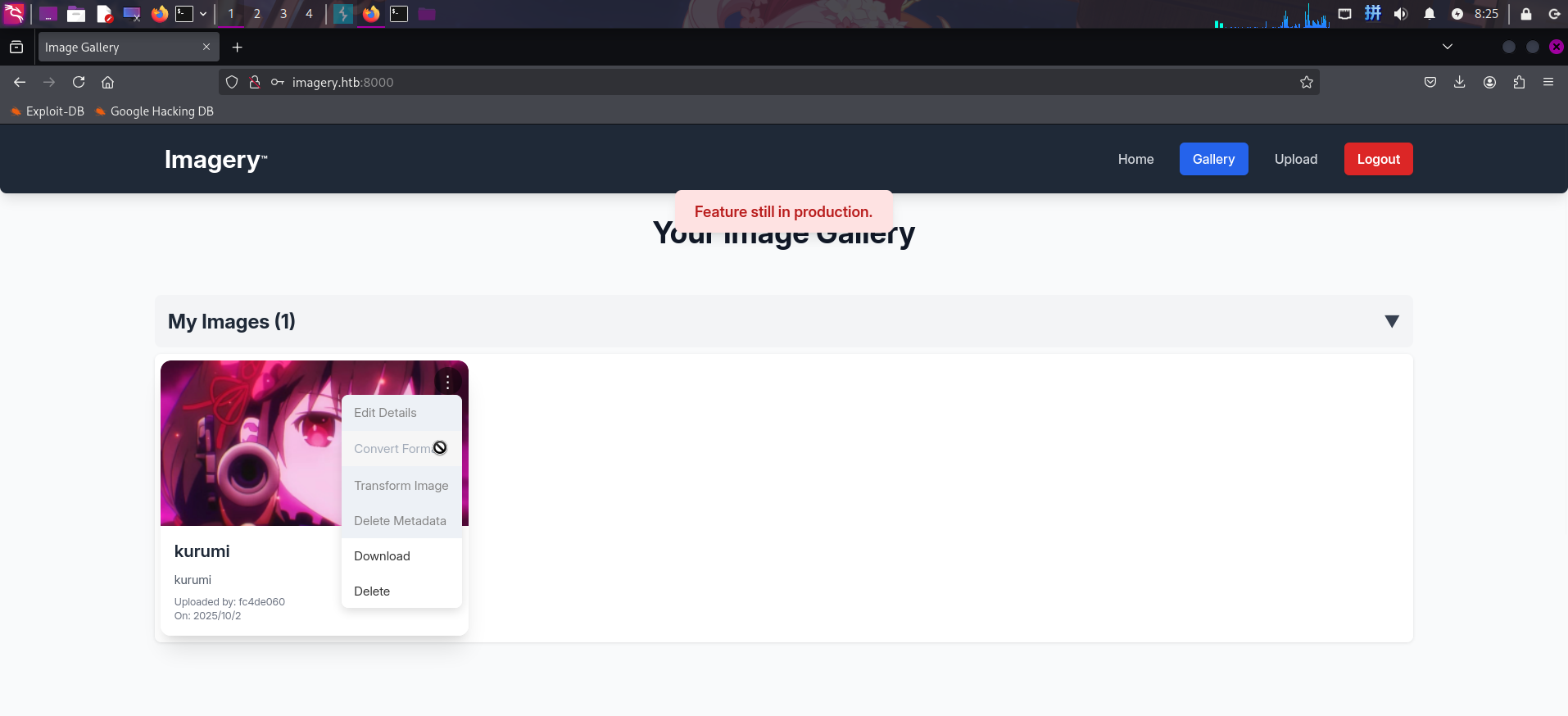 发现图片被上传至/uploads目录,且网站在图片原文件名开头加上了UUID标识符。尝试点击Convert Format、Transform Image等灰色按钮,均提示功能正在开发测试中: