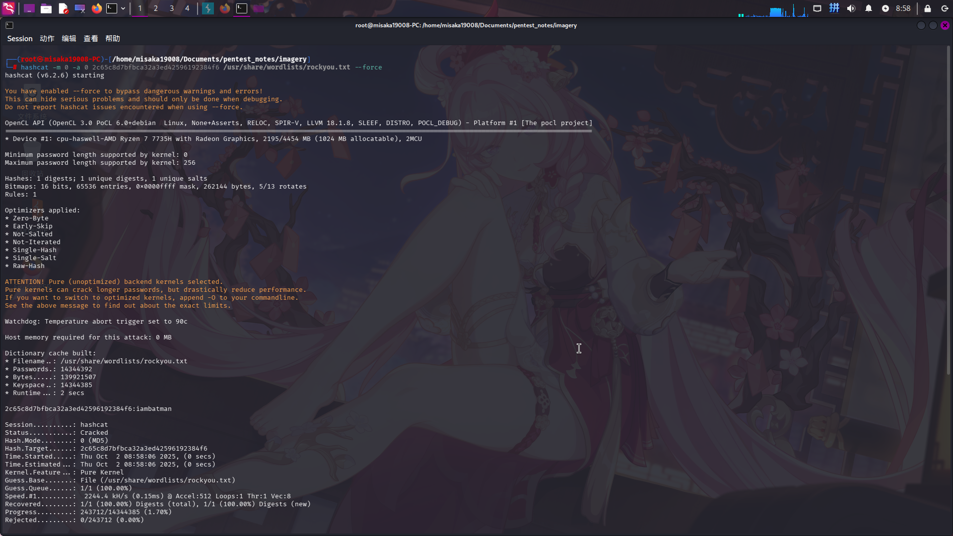 hashcat -m 0 -a 0 2c65c8d7bfbca32a3ed42596192384f6 /usr/share/wordlists/rockyou.txt --force