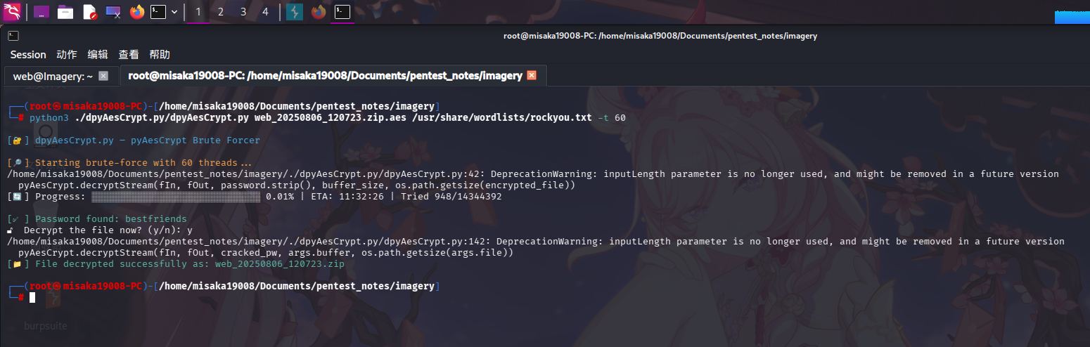 python3 ./dpyAesCrypt.py/dpyAesCrypt.py web_20250806_120723.zip.aes /usr/share/wordlists/rockyou.txt -t 60