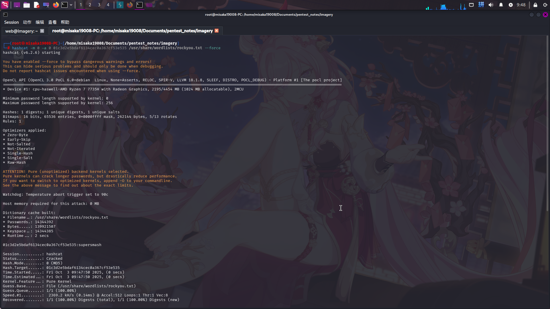 成功获取站点内两个用户的密码哈希信息!尝试使用hashcat工具破解哈希: