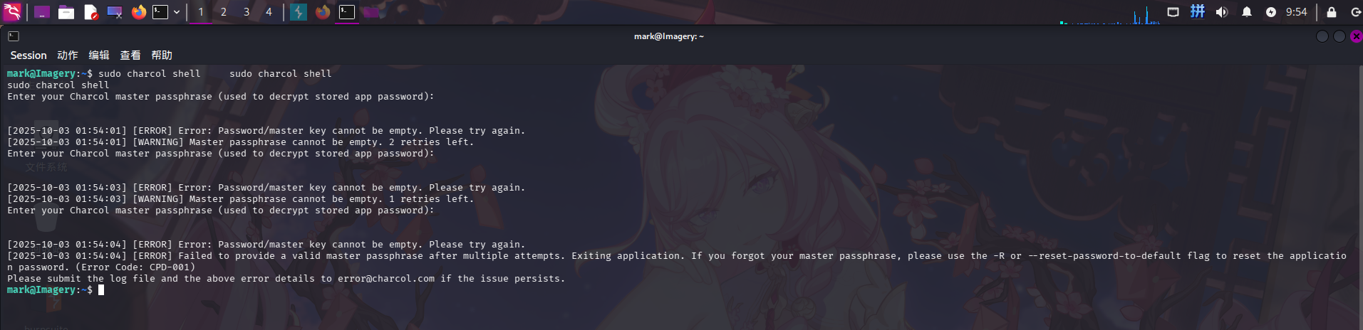 发现需要输入密码,连续输错三次后提示称执行charcol -R可以重置。直接执行: