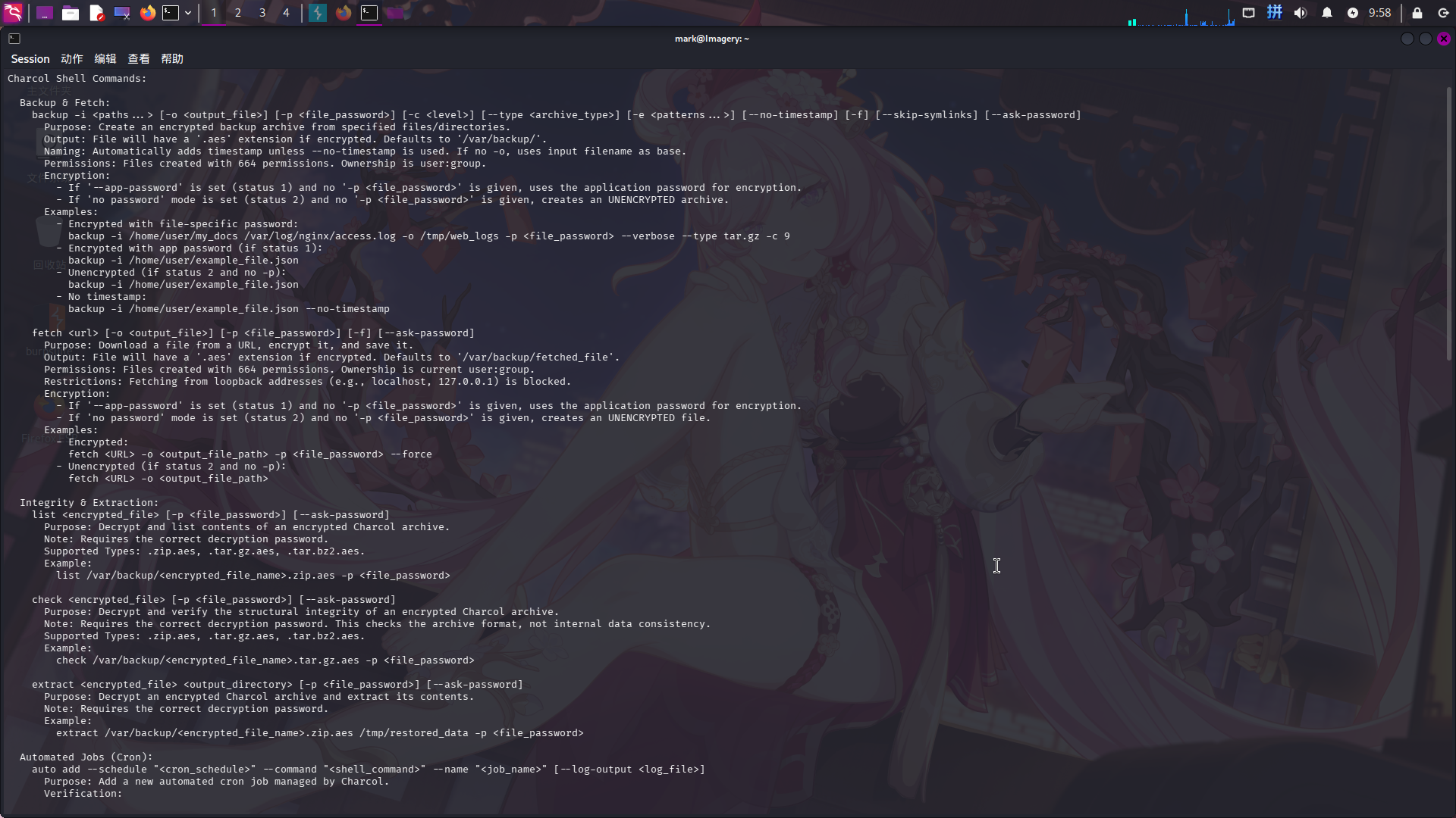 重置密码并配置运行模式后,成功进入了charcol工具的交互式Shell,执行help命令查看帮助:
