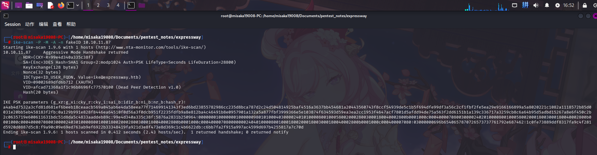 成功捕获返回哈希值!除此以外,还发现IKE服务登录用户名为ike,主机名为expressway.htb,验证方法为PSK预共享密钥。