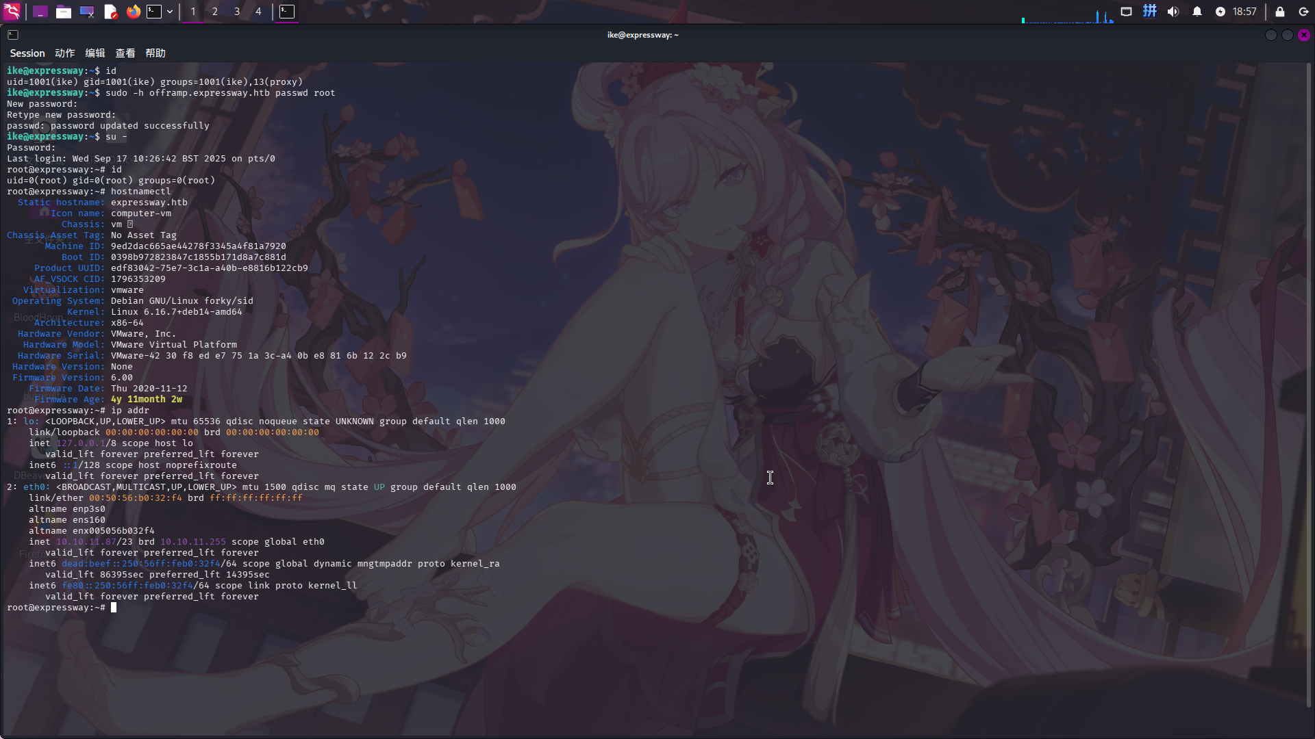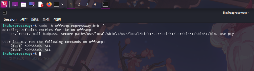 发现用户ikeofframp.expressway.htb主机名下可以root用户身份免密执行任何命令。直接修改root密码,随后切换用户到root