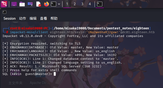 尝试使用impacket-mssqlclient工具登录MSSQL数据库: