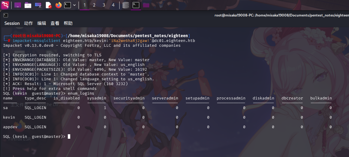 登录成功,尝试执行enum_logins存储过程查看MSSQL用户: