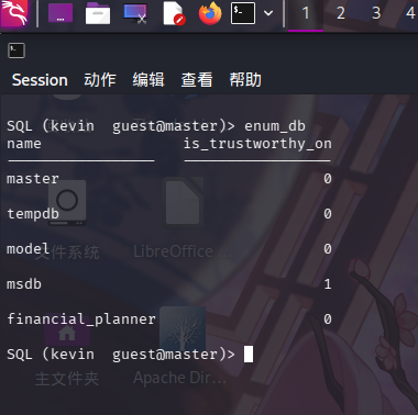 发现存在sa、kevin和appdev三个用户。执行enum_db查看数据库列表: