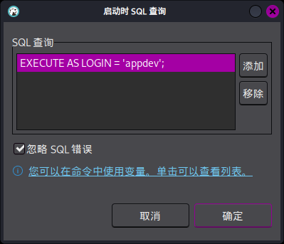 为了将安全上下文自动切换到appdev用户,需要在“初始化”选项卡中点击“启动查询”按钮,添加连接成功后自动切换上下文的语句: