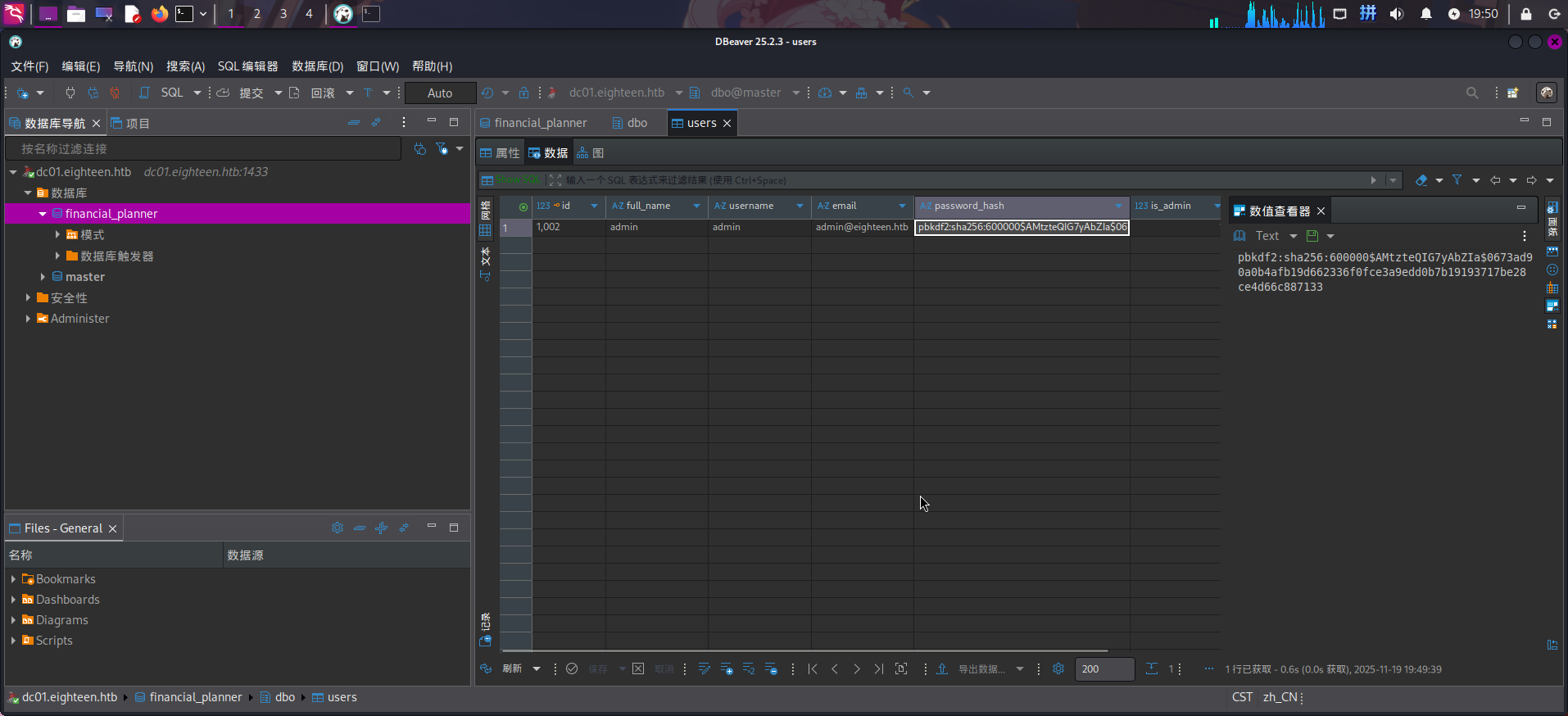 发现模式内存在4张数据表,其中users表存放了用户凭据,双击该表查看: